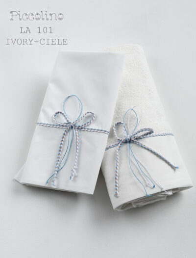 Σετ λαδόπανα Piccolino LA101 IVORY-CIELE. Αποτελείται απο βαμβακερό λαδόπανο, πετσέτα 140*70εκ, εσώρουχα και πετσέτα ιερέα 30*50εκ.