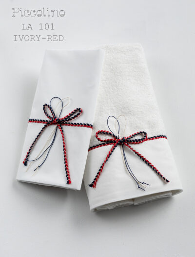 Σετ λαδόπανα Piccolino LA101 IVORY-RED. Αποτελείται απο βαμβακερό λαδόπανο, πετσέτα 140*70εκ, εσώρουχα και πετσέτα ιερέα 30*50εκ.