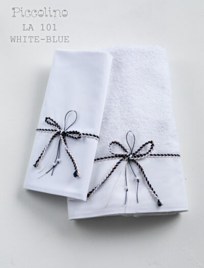 Σετ λαδόπανα Piccolino LA101 WHITE-BLUE. Αποτελείται απο βαμβακερό λαδόπανο, πετσέτα 140*70εκ, εσώρουχα και πετσέτα ιερέα 30*50εκ.