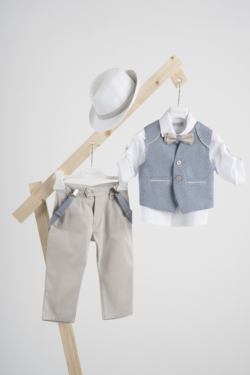 AG25S78.BLUESAND Βαπτιστικό κοστούμι Piccolino Francisco σε χρώμα Blue-Sand. Περιλαμβάνει δίχρωμο γιλέκο με διακοσμητικούς ωμίτες, πουκάμισο βαμβακερό λευκό, παντελόνι βαμβακερό σε χρώμα sand, παπιγιόν με διχρωμία, ζώνη με double D δέσιμο και καπέλο με φάσα. Διαθέσιμο σε 4 μεγέθη 6-12, 12-18, 18-24, 24-36(εξτρά χρέωση)