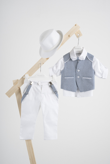 Βαπτιστικό κοστούμι Piccolino Barry-23 σε χρώμα grey. Περιλαμβάνει γιλέκο ραφ, πουκάμισο με γιακά μαο βαμβακερό λευκό, παντελόνι σε χρώμα grey, φουλάρι, τιράντες και καπέλο με φάσα. Διαθέσιμο σε 4 μεγέθη 6-12, 12-18, 18-24, 24-36(εξτρά χρέωση)