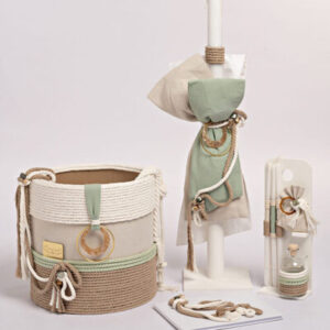 Ένα σετ βάπτισης που το κάνει ξεχωριστό η ιδιαίτερη λαμπάδα με μοναδικό στολισμό στο τελείωμα της στεφανάκι ξύλινο με κορδόνια και φουντίτσες σε αποχρώσεις μπεζ-σπαγγί. Το σετ συμπληρώνουν πουγκί δερματίνη και σετ λαδιού ασορτί. Κάθε πακέτο βάπτισης μπορεί να στολιστεί με οποιοδήποτε ρούχο και θέμα της επιλογής σας.