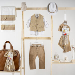 Βαπτιστικό πακέτο Piccolino Enrique beige περιλαμβάνει κοστούμι ,σετ λαδόπανα, λαμπάδα, λαδοσετ και στολισμένη τσάντα καφέ