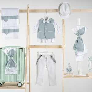 Βαπτιστικό πακέτο Piccolino Francisco mint white περιλαμβάνει κοστούμι ,σετ λαδόπανα, λαμπάδα, λαδοσετ και στολισμένη βαλίτσα mint