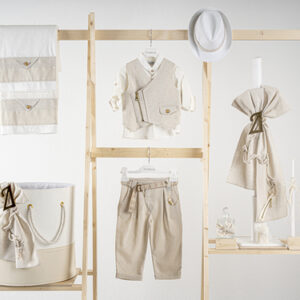 Βαπτιστικό πακέτο Piccolino Enrique beige περιλαμβάνει κοστούμι ,σετ λαδόπανα, λαμπάδα, λαδοσετ και στολισμένο καλάθι