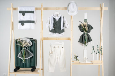 Βαπτιστικό πακέτο Piccolino Jose white περιλαμβάνει κοστούμι ,σετ λαδόπανα, λαμπάδα, λαδοσετ και στολισμένη βαλίτσα green