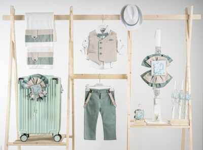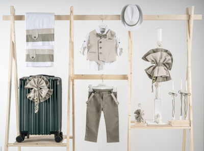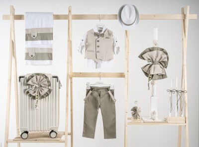 Βαπτιστικό πακέτο Piccolino Gustavo sage περιλαμβάνει κοστούμι ,σετ λαδόπανα, λαμπάδα, λαδοσετ και στολισμένη βαλίτσα CREAM
