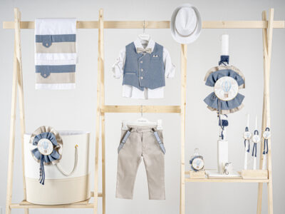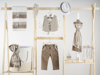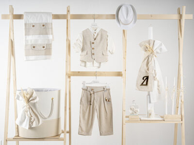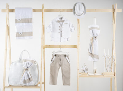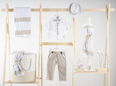 Βαπτιστικό πακέτο Piccolino Lorenzo sand περιλαμβάνει κοστούμι ,σετ λαδόπανα, λαμπάδα, λαδοσετ και στολισμένο καλάθι
