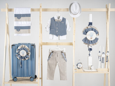 Βαπτιστικό πακέτο Piccolino Lorenzo sand περιλαμβάνει κοστούμι ,σετ λαδόπανα, λαμπάδα, λαδοσετ και στολισμένη βαλίτσα CREAM
