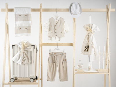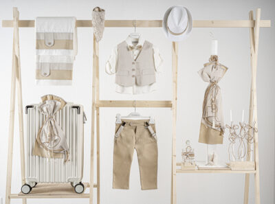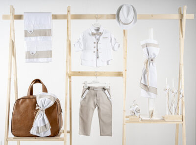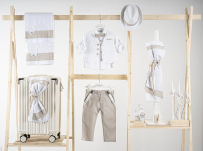 Βαπτιστικό πακέτο Piccolino lewis beige περιλαμβάνει κοστούμι ,σετ λαδόπανα, λαμπάδα, λαδοσετ και στολισμένη βαλίτσα CREAM