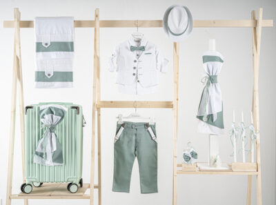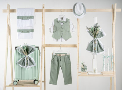 Βαπτιστικό πακέτο Piccolino Gustavo sage περιλαμβάνει κοστούμι ,σετ λαδόπανα, λαμπάδα, λαδοσετ και στολισμένη βαλίτσα green