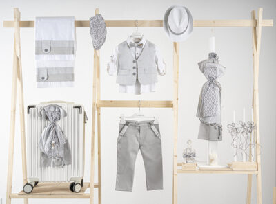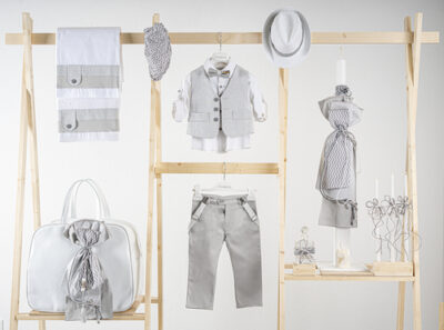 Βαπτιστικό πακέτο Piccolino Pablo silver περιλαμβάνει κοστούμι ,σετ λαδόπανα, λαμπάδα, λαδοσετ και στολισμένη βαλίτσα CREAM