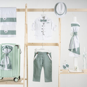 Βαπτιστικό πακέτο Piccolino Gustavo sage περιλαμβάνει κοστούμι ,σετ λαδόπανα, λαμπάδα, λαδοσετ και στολισμένη βαλίτσα green