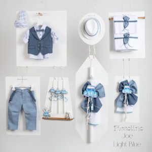 Σετ βάπτισης Piccolino JOE LIGHT BLUE. Περιλαμβάνει λαδόπανο (πετσέτα 450gsm και σεντόνι 70*140εκ, εσώρουχα και πετσέτα ιερέα), λαμπάδα στολισμένη, στολισμό συσκευασίας (μπραντς), λαδοσέτ (στολισμένα 3κεράκια, μπουκαλάκι,σαπούνι) .Το ρούχο δεν περιλαμβάνεται στην τιμη του σετ βάπτισης.