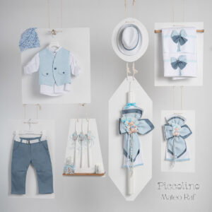 Σετ βάπτισης Piccolino MATEO RAF. Περιλαμβάνει λαδόπανο (πετσέτα 450gsm και σεντόνι 70*140εκ, εσώρουχα και πετσέτα ιερέα), λαμπάδα στολισμένη, στολισμό συσκευασίας (μπραντς), λαδοσέτ (στολισμένα 3κεράκια, μπουκαλάκι,σαπούνι) .Το ρούχο δεν περιλαμβάνεται στην τιμη του σετ βάπτισης.