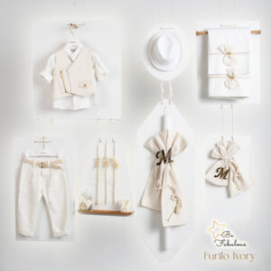 Σετ βάπτισης Be Fabulous FURILLO IVORY. Περιλαμβάνει λαδόπανο (πετσέτα 450gsm και σεντόνι 70*140εκ, εσώρουχα και πετσέτα ιερέα), λαμπάδα στολισμένη, στολισμό συσκευασίας (μπραντς), λαδοσέτ (στολισμένα 3κεράκια, μπουκαλάκι,σαπούνι) .Το ρούχο δεν περιλαμβάνεται στην τιμη του σετ βάπτισης.