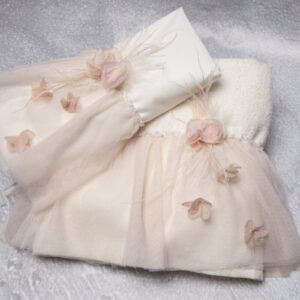 Σετ λαδόπανα Piccolino LK-TIFFANY IVORY. Αποτελείται απο βαμβακερό λαδόπανο, πετσέτα 140*70εκ, εσώρουχα και πετσέτα ιερέα 30*50εκ. Στολισμένα με χειροποίητα υφασμάτινα λουλούδια. Συνοδευτικό του φορέματος Piccolino TIFFANY IVORY