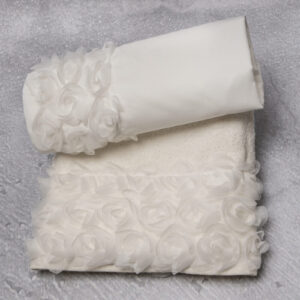 Σετ λαδόπανα Piccolino LK-NOVA IVORY. Αποτελείται απο βαμβακερό λαδόπανο, πετσέτα 140*70εκ, εσώρουχα και πετσέτα ιερέα 30*50εκ. Στολισμένα με χειροποίητα υφασμάτινα λουλούδια. Συνοδευτικό του φορέματος Piccolino NOVA IVORY
