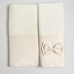 Σετ λαδόπανα Piccolino LK-ARIADNE IVORY. Αποτελείται απο βαμβακερό λαδόπανο, πετσέτα 140*70εκ, εσώρουχα και πετσέτα ιερέα 30*50εκ. Στολισμένα με χειροποίητα υφασμάτινα λουλούδια. Συνοδευτικό του φορέματος Piccolino ARIADNE Ivory