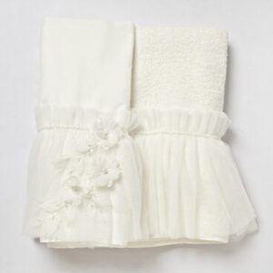 Σετ λαδόπανα Piccolino LK-ARIADNE IVORY. Αποτελείται απο βαμβακερό λαδόπανο, πετσέτα 140*70εκ, εσώρουχα και πετσέτα ιερέα 30*50εκ. Στολισμένα με χειροποίητα υφασμάτινα λουλούδια. Συνοδευτικό του φορέματος Piccolino ARIADNE Ivory