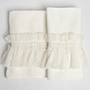 Σετ λαδόπανα Piccolino LK-ARIADNE IVORY. Αποτελείται απο βαμβακερό λαδόπανο, πετσέτα 140*70εκ, εσώρουχα και πετσέτα ιερέα 30*50εκ. Στολισμένα με χειροποίητα υφασμάτινα λουλούδια. Συνοδευτικό του φορέματος Piccolino ARIADNE Ivory