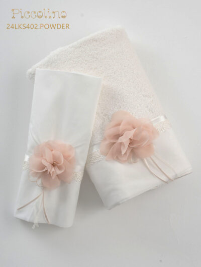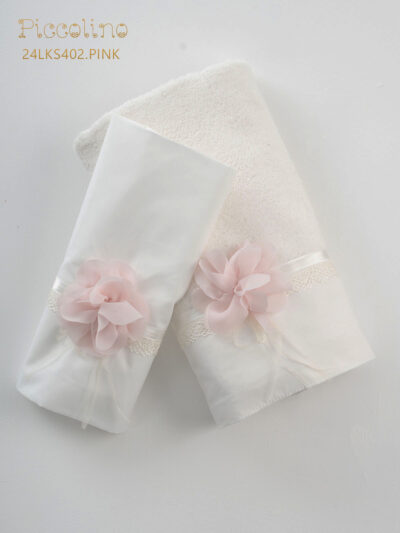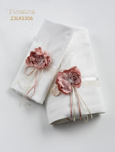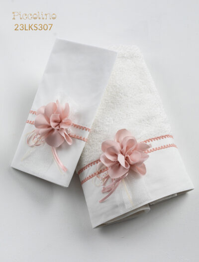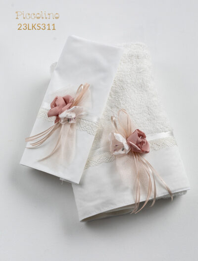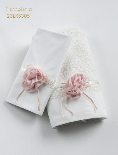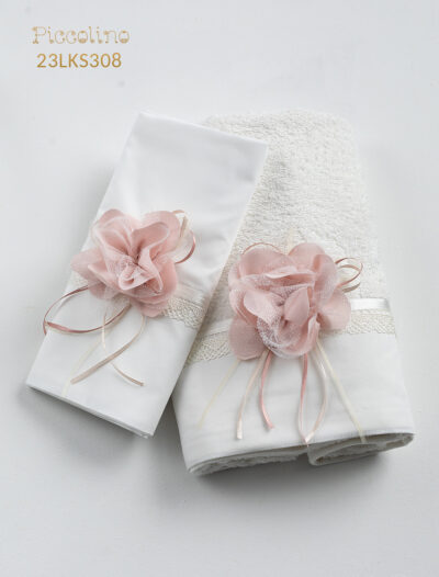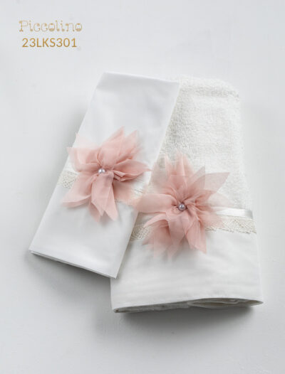 Σετ λαδόπανα Piccolino LK-YASMINE PINK. Αποτελείται απο βαμβακερό λαδόπανο, πετσέτα 140*70εκ, εσώρουχα και πετσέτα ιερέα 30*50εκ. Στολισμένα με χειροποίητα υφασμάτινα λουλούδια. Συνοδευτικό του φορέματος Piccolino YASMINE PINK