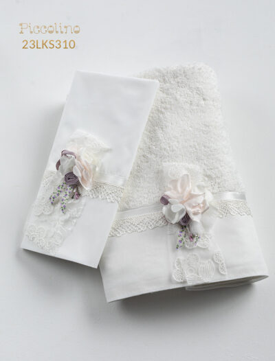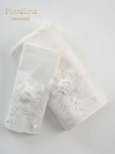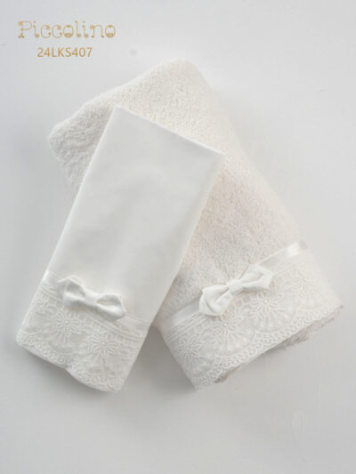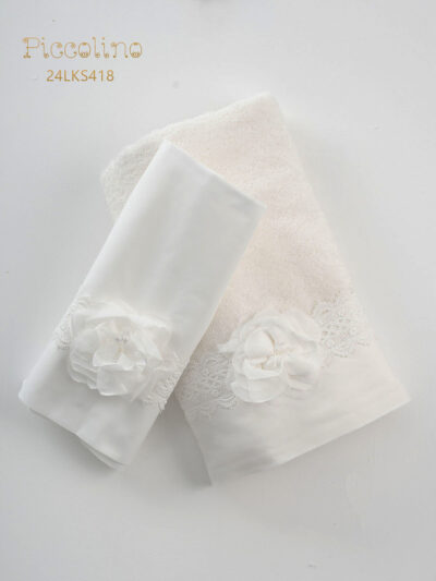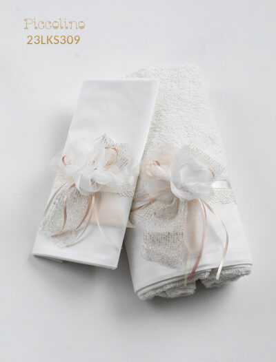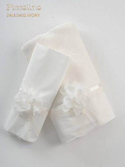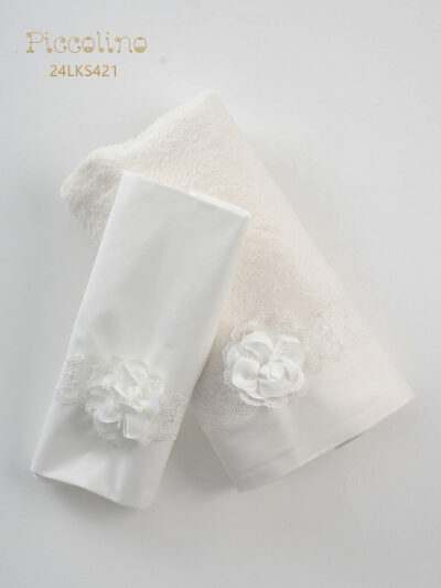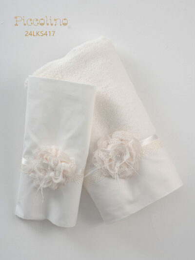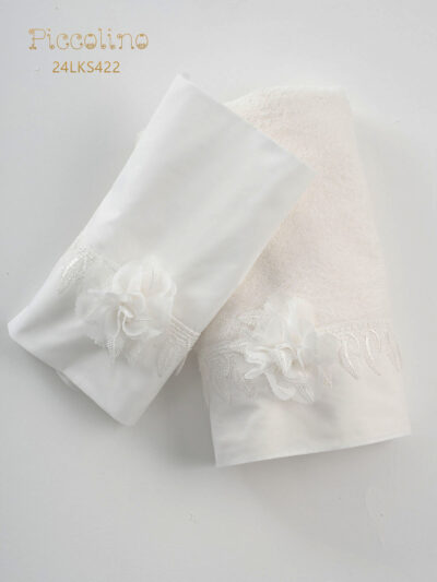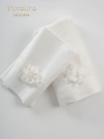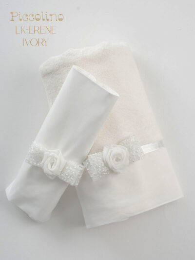 Σετ λαδόπανα Piccolino LK-ERENE IVORY. Αποτελείται απο βαμβακερό λαδόπανο, πετσέτα 140*70εκ, εσώρουχα και πετσέτα ιερέα 30*50εκ. Στολισμένα με χειροποίητα υφασμάτινα λουλούδια. Συνοδευτικό του φορέματος Piccolino ERENE IVORY