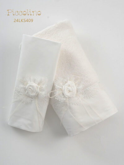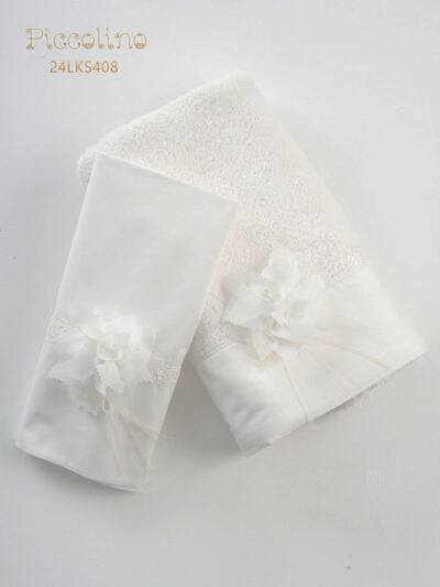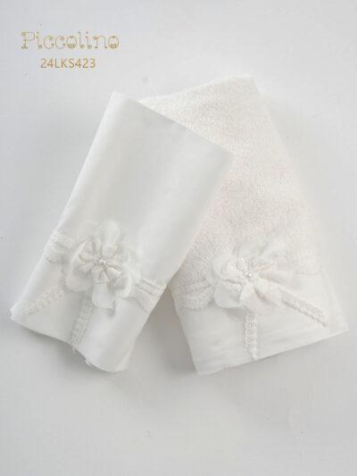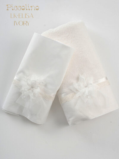 Σετ λαδόπανα Piccolino LK-ELISA IVORY. Αποτελείται απο βαμβακερό λαδόπανο, πετσέτα 140*70εκ, εσώρουχα και πετσέτα ιερέα 30*50εκ. Στολισμένα με χειροποίητα υφασμάτινα λουλούδια. Συνοδευτικό του φορέματος Piccolino ELISA IVORY
