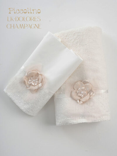 Σετ λαδόπανα Piccolino LK-DOLORES CHAMPAGNE. Αποτελείται απο βαμβακερό λαδόπανο, πετσέτα 140*70εκ, εσώρουχα και πετσέτα ιερέα 30*50εκ. Στολισμένα με χειροποίητα υφασμάτινα λουλούδια. Συνοδευτικό του φορέματος Piccolino DOLORES CHAMPAGNE