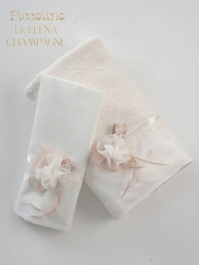 Σετ λαδόπανα Piccolino LK-ELENA CHAMPAGNE. Αποτελείται απο βαμβακερό λαδόπανο, πετσέτα 140*70εκ, εσώρουχα και πετσέτα ιερέα 30*50εκ. Στολισμένα με χειροποίητα υφασμάτινα λουλούδια. Συνοδευτικό του φορέματος Piccolino ELENA CHAMPAGNE