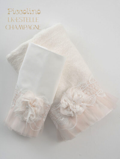 Σετ λαδόπανα Piccolino LK-ESTELLE CHAMPAGNE. Αποτελείται απο βαμβακερό λαδόπανο, πετσέτα 140*70εκ, εσώρουχα και πετσέτα ιερέα 30*50εκ. Στολισμένα με χειροποίητα υφασμάτινα λουλούδια. Συνοδευτικό του φορέματος Piccolino ESTELLE CHAMPAGNE