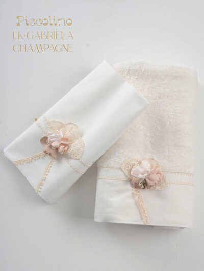 Σετ λαδόπανα Piccolino LK-GABRIELA CHAMPAGNE. Αποτελείται απο βαμβακερό λαδόπανο, πετσέτα 140*70εκ, εσώρουχα και πετσέτα ιερέα 30*50εκ. Στολισμένα με χειροποίητα υφασμάτινα λουλούδια. Συνοδευτικό του φορέματος Piccolino GABRIELA CHAMPAGNE