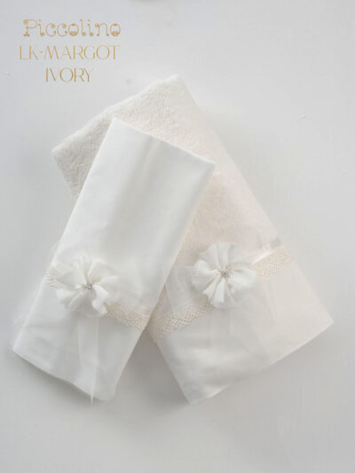Σετ λαδόπανα Piccolino LK-MARGOT IVORY. Αποτελείται απο βαμβακερό λαδόπανο, πετσέτα 140*70εκ, εσώρουχα και πετσέτα ιερέα 30*50εκ. Στολισμένα με χειροποίητα υφασμάτινα λουλούδια. Συνοδευτικό του φορέματος Piccolino MARGOT IVORY