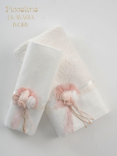 Σετ λαδόπανα Piccolino LK-MARIA IVORY. Αποτελείται απο βαμβακερό λαδόπανο, πετσέτα 140*70εκ, εσώρουχα και πετσέτα ιερέα 30*50εκ. Στολισμένα με χειροποίητα υφασμάτινα λουλούδια. Συνοδευτικό του φορέματος Piccolino MARIA IVORY