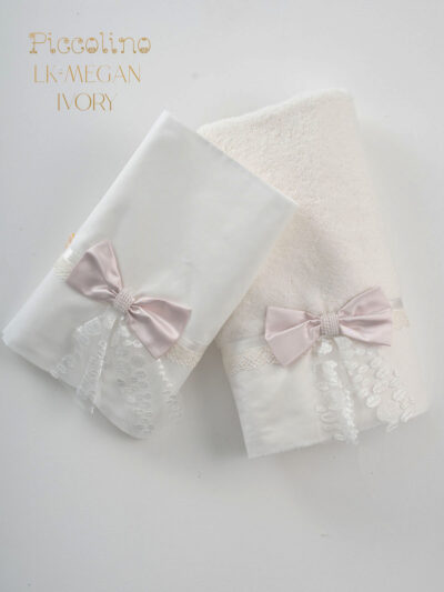 Σετ λαδόπανα Piccolino LK-MEGAN IVORY. Αποτελείται απο βαμβακερό λαδόπανο, πετσέτα 140*70εκ, εσώρουχα και πετσέτα ιερέα 30*50εκ. Στολισμένα με χειροποίητα υφασμάτινα λουλούδια. Συνοδευτικό του φορέματος Piccolino MEGAN IVORY
