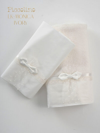 Σετ λαδόπανα Piccolino LK-MONICA IVORY. Αποτελείται απο βαμβακερό λαδόπανο, πετσέτα 140*70εκ, εσώρουχα και πετσέτα ιερέα 30*50εκ. Στολισμένα με χειροποίητα υφασμάτινα λουλούδια. Συνοδευτικό του φορέματος Piccolino MONICA IVORY