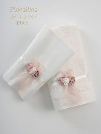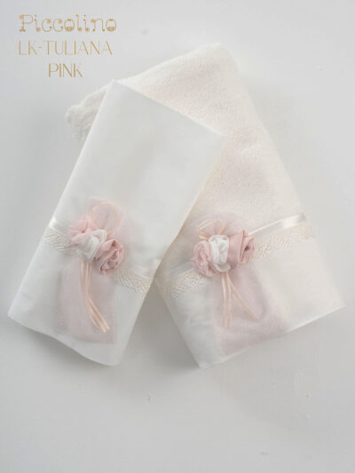 Σετ λαδόπανα Piccolino LK-TULIANA PINK. Αποτελείται απο βαμβακερό λαδόπανο, πετσέτα 140*70εκ, εσώρουχα και πετσέτα ιερέα 30*50εκ. Στολισμένα με χειροποίητα υφασμάτινα λουλούδια. Συνοδευτικό του φορέματος Piccolino TULIANA PINK