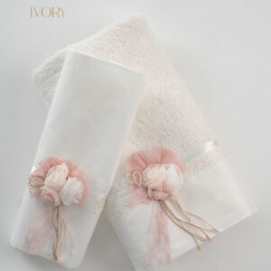 Σετ λαδόπανα Piccolino LK-ERENE IVORY. Αποτελείται απο βαμβακερό λαδόπανο, πετσέτα 140*70εκ, εσώρουχα και πετσέτα ιερέα 30*50εκ. Στολισμένα με χειροποίητα υφασμάτινα λουλούδια. Συνοδευτικό του φορέματος Piccolino ERENE IVORY
