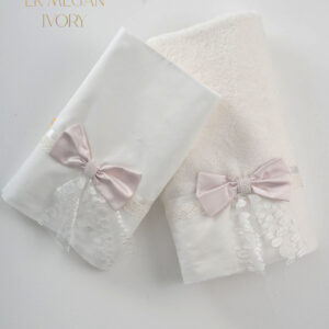 Σετ λαδόπανα Piccolino LK-ERENE IVORY. Αποτελείται απο βαμβακερό λαδόπανο, πετσέτα 140*70εκ, εσώρουχα και πετσέτα ιερέα 30*50εκ. Στολισμένα με χειροποίητα υφασμάτινα λουλούδια. Συνοδευτικό του φορέματος Piccolino ERENE IVORY