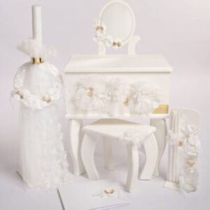 K2501 Ένα μικρό έπιπλο για να στολίσει την βάπτιση του παιδιού σας. Ξύλινο μπουντουάρ λευκό με χρυσές λεπτομέρειες. Λευκά τουλια πούπουλα πέρλες και τρισδιάστατα λουλούδια στολίζουν το πακέτο αυτό! Λαμπάδα, σετ λαδιού μπορούν να συνδυαστούν με πολλά από τα φορέματα της φετινής μας συλλογής και όχι μόνο!
