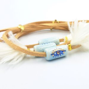 Μαρτυρικό βραχιόλι, μπεζ σουέτ, φτερό λευκό χρώμα, κεραμική χάντρα με μάτι και σταυρός. Οι φωτογραφίες έχουν υποστεί επεξεργασία και τα χρώματα ίσως να διαφέρουν λίγο στην πραγματικότητα. Η τιμή αφορά συσκευασία 50 τεμαχίων.