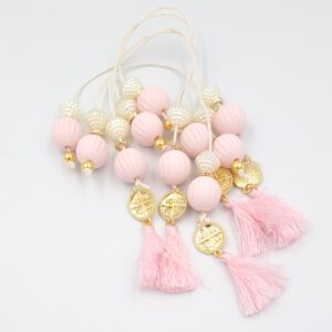 Μαρτυρικό μπεγλέρι, εκρού χρώμα, ροζ-λευκές χάντρες σταυρός χρυσό χρώμα. Οι φωτογραφίες έχουν υποστεί επεξεργασία και τα χρώματα ίσως να διαφέρουν λίγο στην πραγματικότητα. Η τιμή αφορά συσκευασία 50 τεμαχίων.