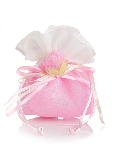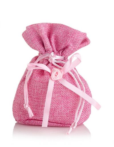 Μπομπονιέρα Πουγκί λινό ροζ. Διάστ.: 14 x 20 cm με κουφέτα Χατζηγιαννάκης