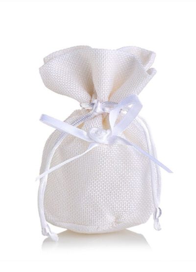 Μπομπονιέρα Πουγκί 14x20cm από μετάξι σαντούκ. Σε λευκή απόχρωση Διαφορετικές διαστάσεις κατόπιν συνεννόησης Διάστ.: 14x20cm με κουφέτα Χατζηγιαννάκης