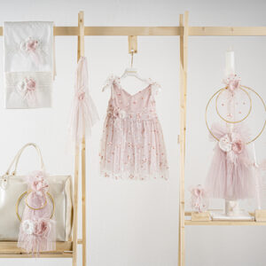 Βαπτιστικό πακέτο Piccolino Salina ivory περιλαμβάνει φόρεμα ,σετ λαδόπανα, λαμπάδα, λαδοσετ και στολισμένη βαλίτσα pink