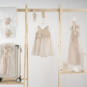 Βαπτιστικό πακέτο Piccolino Thea beige περιλαμβάνει φόρεμα ,σετ λαδόπανα, λαμπάδα, λαδοσετ και στολισμένη βαλίτσα ecru