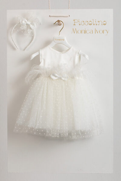 Βαπτιστικό φόρεμα Piccolino Monica ivory, Φόρεμα μεσάτο με μπούστο απο σατέν. Ζωνάκι απο δαντέλα και μαραμπού πούπουλα. Τούλινη φούστα απο ανάγλυφο πουά τούλι. Το ντεκόρ του φορέματος αποτελείται απο σατέν φιογκό. Το φόρεμα συνοδέυεται απο στέκα με ντεκόρ όμοιο με το φόρεμα. Διαθέσιμο σε 4 μεγέθη: 6-12, 12-18, 18-24, 24-36(εξτρά χρέωση)