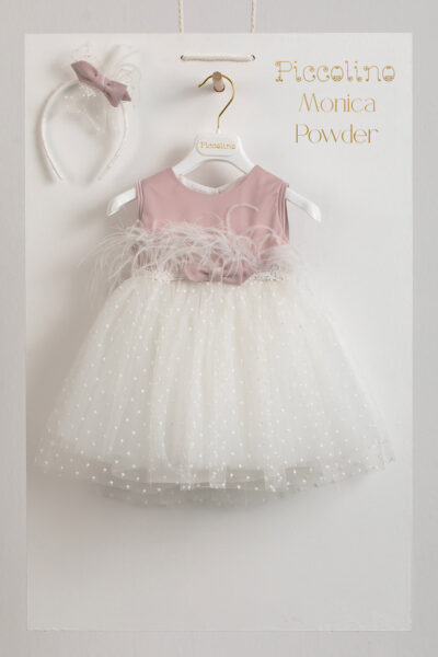 Βαπτιστικό φόρεμα Piccolino Monica Powder, Φόρεμα μεσάτο με μπούστο απο σατέν. Ζωνάκι απο δαντέλα και μαραμπού πούπουλα. Τούλινη φούστα απο ανάγλυφο πουά τούλι. Το ντεκόρ του φορέματος αποτελείται απο σατέν φιογκό. Το φόρεμα συνοδέυεται απο στέκα με ντεκόρ όμοιο με το φόρεμα. Διαθέσιμο σε 4 μεγέθη: 6-12, 12-18, 18-24, 24-36(εξτρά χρέωση)