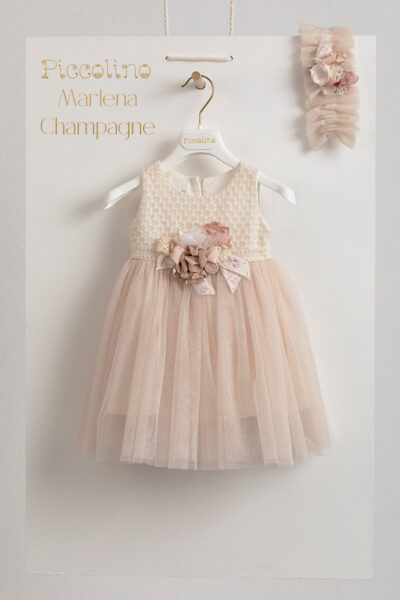 Βαπτιστικό φόρεμα Piccolino Marlena Champagne. Μπούστο απο δαντέλα πάνω απο τούλι με γκλίτερ. Τούλινη εκρού φούστα με γκλίτερ. Δαντελόνιο ζωνάκι. Το ντεκόρ του φορέματος αποτελείται απο εντυπωσιακή σύνθεση με χειροποίητα λουλούδια. Το φόρεμα συνοδέυεται απο κορδέλα με ντεκόρ όμοιο με το φόρεμα. Διαθέσιμο σε 4 μεγέθη: 6-12, 12-18, 18-24, 24-36(εξτρά χρέωση)