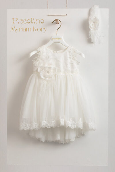 Βαπτιστικό φόρεμα Piccolino Myriam Ivory. Κλασάτο φόρεμα με μπούστο απο πουά κεντητό τούλι, με δαντέλα στο στο μανίκι. Ασύμμετρη τούλινη φούστα με μακρυά ουρά και δαντέλα στο τελείωμα. Δαντελένιο ζωνάκι στην μέση. Το ντεκόρ του φορέματος αποτελείται απο χειροποίητα λουλούδια, στρας και πούπουλο μαραμπού. Το φόρεμα συνοδέυεται απο κορδέλα με ντεκόρ όμοιο με το φόρεμα. Διαθέσιμο σε 4 μεγέθη: 6-12, 12-18, 18-24, 24-36(εξτρά χρέωση)